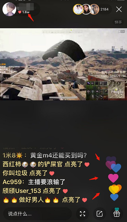 直播业市场正处于高速成长期,遍地开花的直播行业中,秀场和游戏是传统互联网直播的主要内容,泛娱乐时尚类以及包括美妆、体育、健身、财经等垂直领域类直播纷纷出现,那么快手直播爱心点亮有什么用呢?显而易见,爱心点亮可以提升活跃度,增加人气,量大的话打赏的人也多了起来。快手直播爱心点亮的展示效果如下图所示